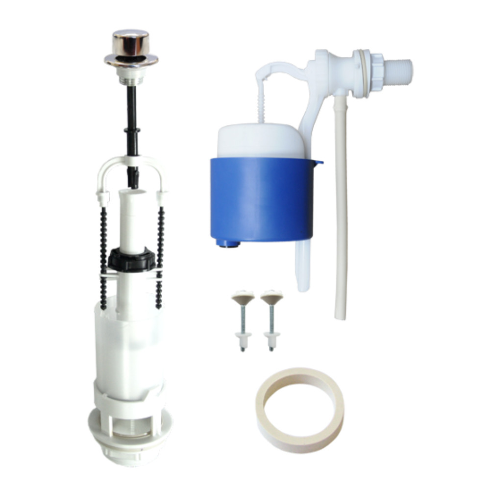 наполнительный клапан К 56.00.00 с пластиковым штуцером, выпускной клапан К 110.00.00 с металлизированной или пластиковой ручкой, комплект крепежа, прокладка между бачком и унитазом, паспорт-инструкция по установке.