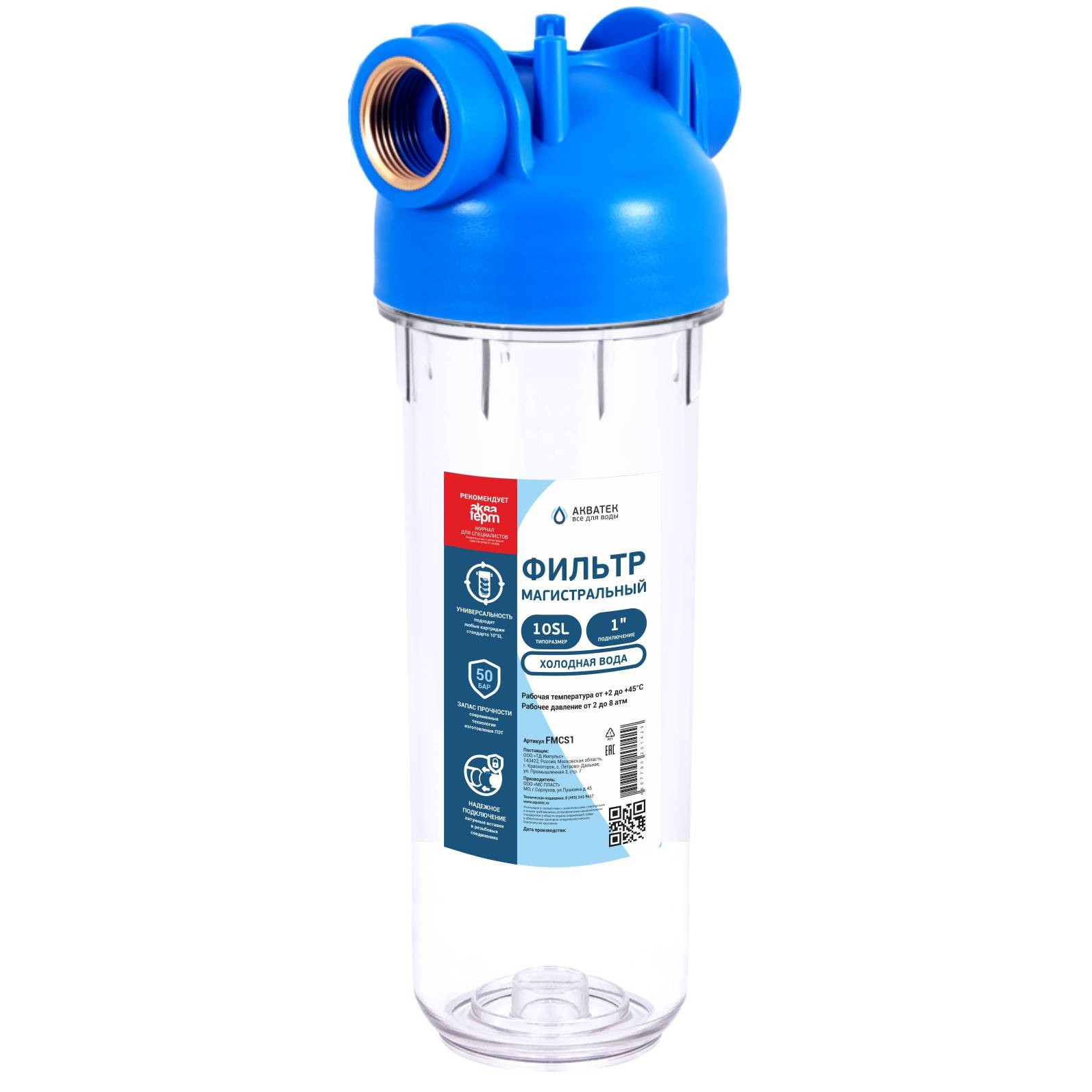 Фильтр магистральный Акватек для хол. воды (прозрачный корпус ПЭТ 10") 1" без картриджа, 0-25-2756