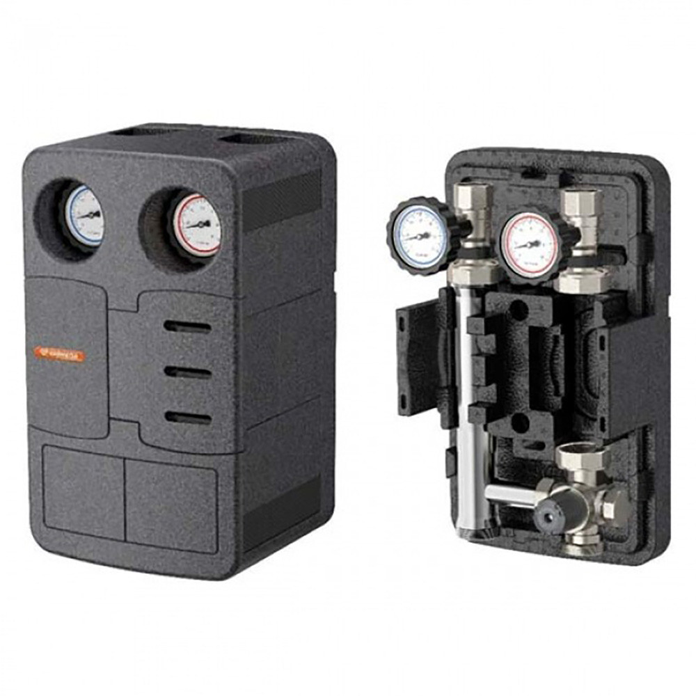 Термоизоляция является многокомпонентной и состоит из прочного изоляционного кожуха с фиксирующими элементами, что минимизирует потери тепла и одновременно не дает перегреваться электронике (например, в насосе). При установке на распределительный коллектор отопления теплоизоляция насосной группы может быть легко снята и вновь установлена.