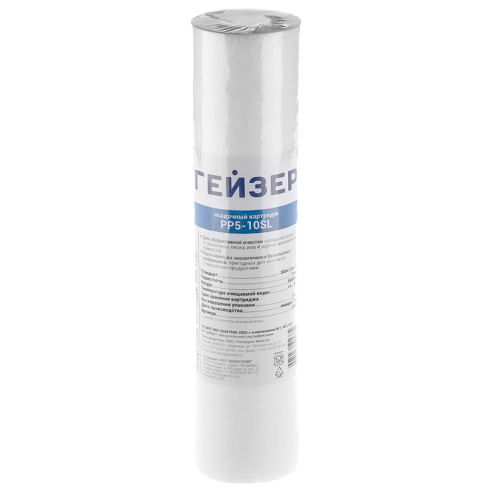 Картридж PP 5 - 10SL применяется в бытовых фильтрах Гейзер 3, Гейзер БИО, Гейзер Ультра БИО, в системе обратного осмоса Гейзер Престиж и в магистральном фильтре Гейзер 1П для предварительной очистки воды от нерастворимых примесей (более 5 мкм). Производство: Россия.