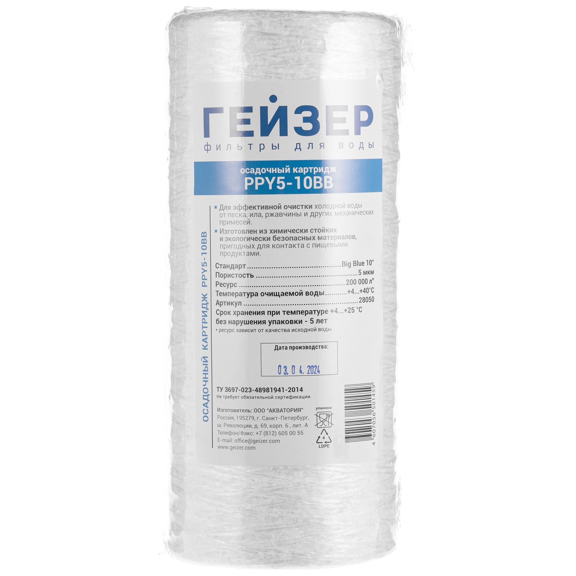 Картридж механической очистки воды ВВ10, 5мкм, полипропиленовая нить (28050) (Гейзер)