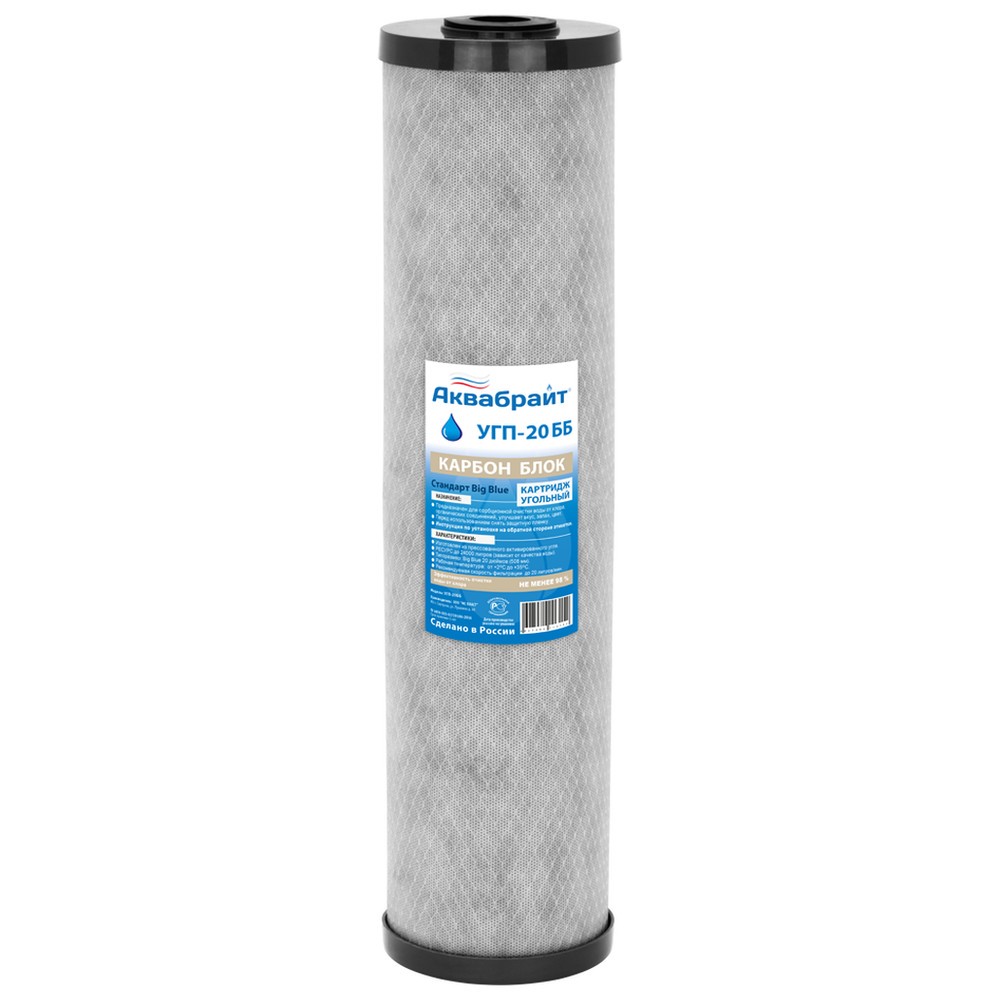Картридж АКВАБРАЙТ УГП-20 ББ изготовлен из спеченного прессованного активированного угля с пищевым допуском.