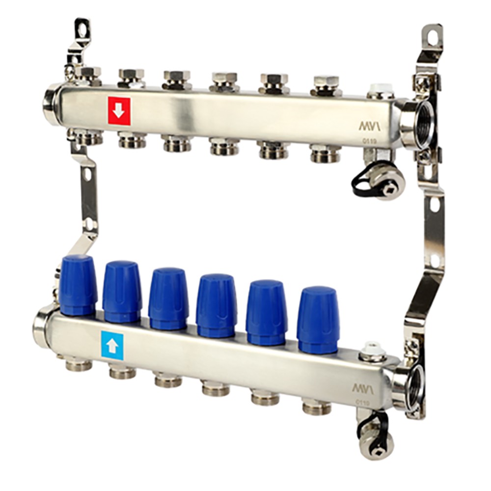 Коллекторные блоки MVI предназначены для распределения потока рабочей среды систем водяного отопления по потребителям. При этом под «потребителем» понимается отдельный нагревательный прибор или группа приборов, контур или петля «теплого пола», отдельные части или ветви системы. Коллекторный блок объединяет в себе подающий и обратный коллекторы из нержавеющей стали, запорные клапаны, термостатические клапаны (с возможностью установки электротермического сервопривода) и крепежные кронштейны. Коллекторные блоки могут работать как на водяном, так и низкозамерзающем (гликолевом) теплоносителе. Коллекторные блоки выпускаются с количеством выходов от 2 до 12. Присоединение циркуляционных петель осуществляется с помощью фитингов стандарта «евроконус» 3/4" (НР).