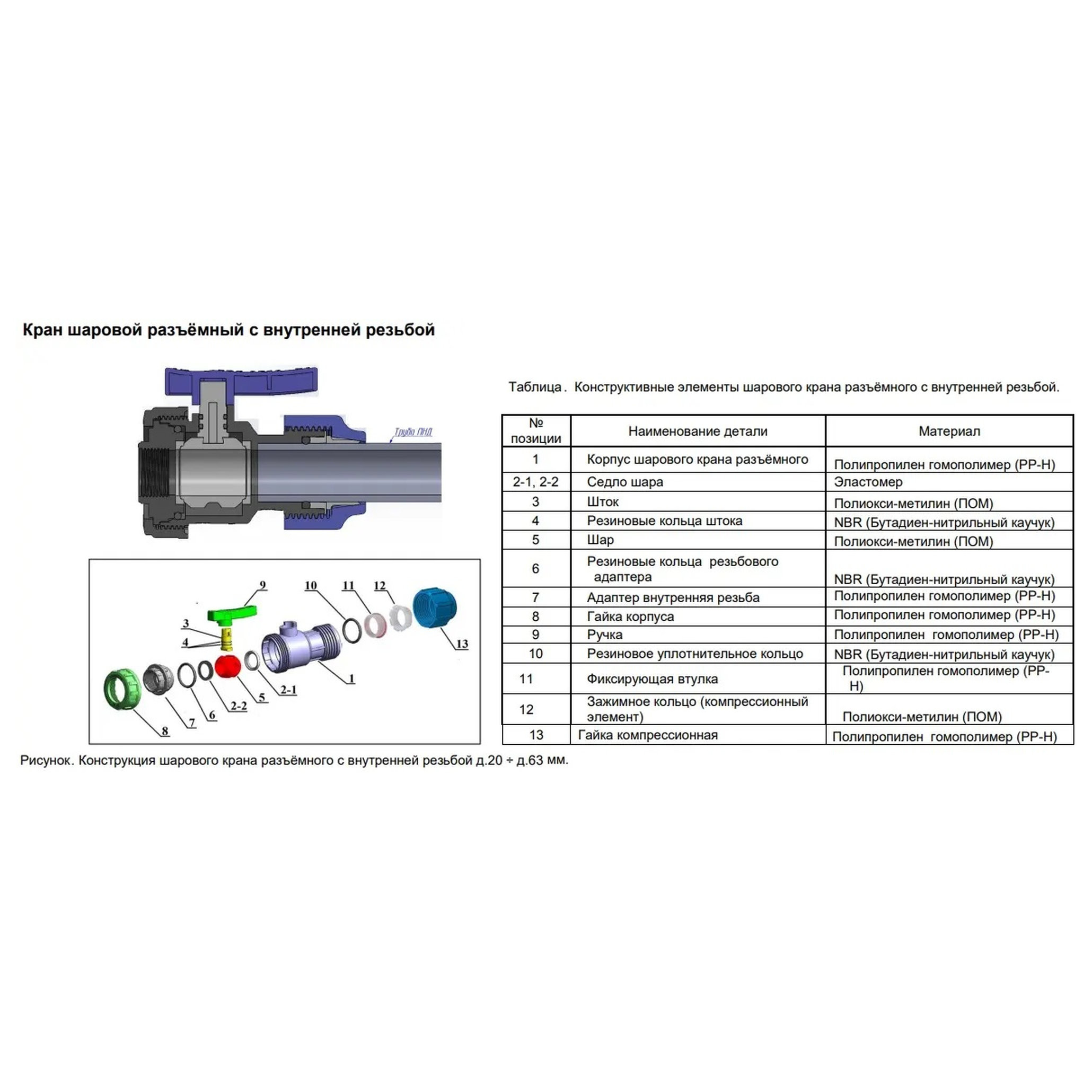 Кран шаровой разъемный компрессионного типа с внутренней резьбой предназначен для регулирования потока воды в трубопроводных системах (трубы ПНД, PE-RT и другие) питьевого и технического холодного водоснабжения жилых и общественных зданий, в системах орошения и полива, при строительстве фонтанов и бассейнов. Кран шаровой может использоваться совместно с пластиковыми фитингами, так и с фитингами из других материалов.
