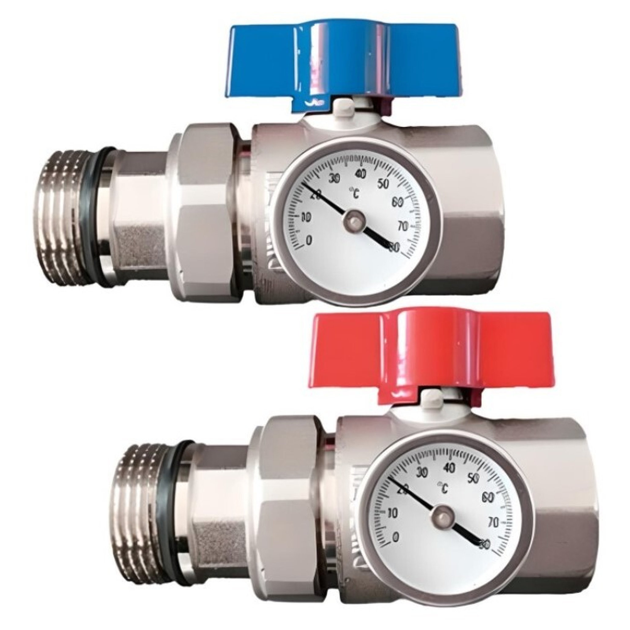 Комплектация: два крана с красной и синей ручкой-бабочкой для разделения горячего и холодного потока (подачи и обратки).