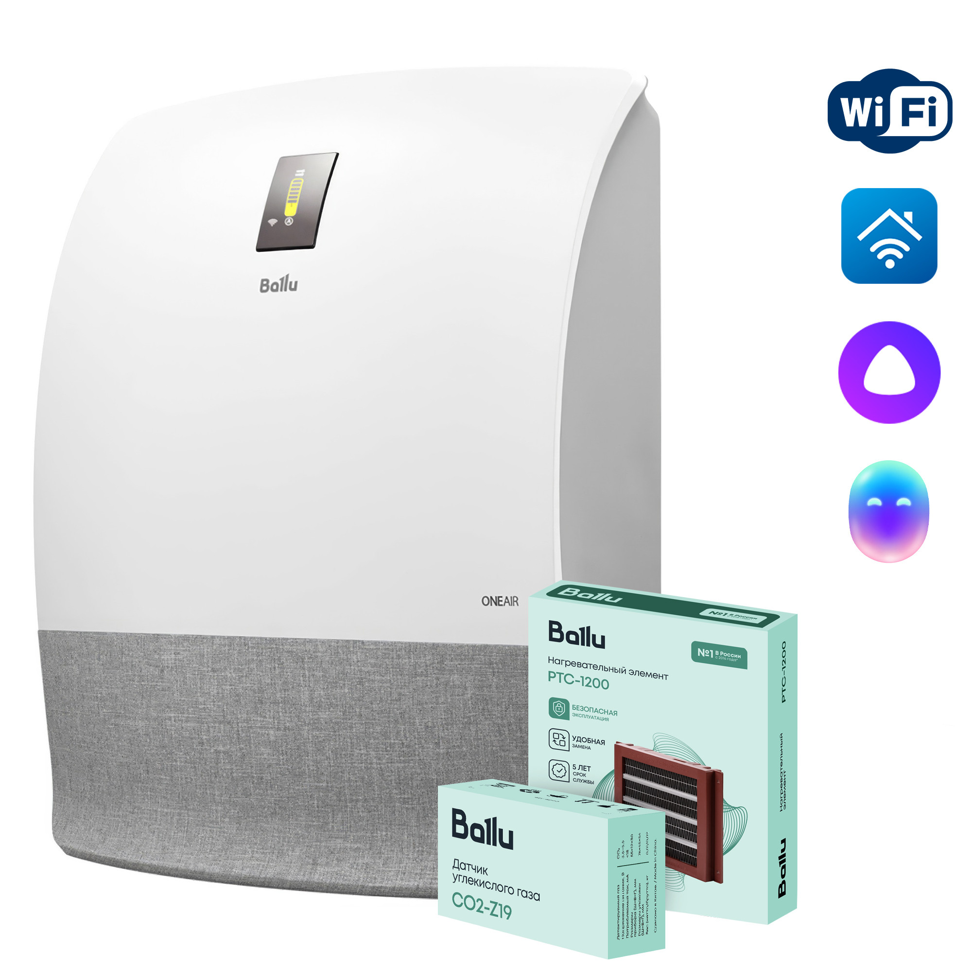 Ballu ONEAIR ASP-200SMAX – инверторный приточный очиститель воздуха с интеллектом. Передняя панель корпуса покрыта стильной и технологичной тканью, которая будет сочетаться с любым дизайнерским решением в вашем помещении. Предназначен для подачи свежего и очищенного воздуха в любые жилые помещения площадью до 75 кв.м. В комплекте высокоэффективный керамический нагревательный элемент мощностью 1200 Вт, который подогревает входящий воздух. При этом прибор эффективно работает в осенне-зимний период при температуре наружного воздуха до -40°С. Профессиональная система очистки воздуха, состоящая из 6 ступеней, устраняет 99,9% загрязнений в воздухе, поглощает неприятные запахи, обеззараживает от вирусов и бактерий. В приборе есть арома-капсула для масел, позволяющая создать индивидуальную атмосферу на любой вкус. Встроенный датчик РМ2,5 в зависимости от качества воздуха автоматически управляет интенсивностью очистки в режиме циркуляции. Датчик CO2 (в комплекте) контролирует уровень углекислого газа в помещении и автоматически управляет клапаном притока, поддерживая оптимальный уровень CO2. Прибор имеет удобный интерфейс, который обеспечивают цветной дисплей и полифонический звуковой сигнал, встроенный Wi-Fi модуль для удаленного управления прибора с мобильных устройств, пульт ДУ в комплекте.