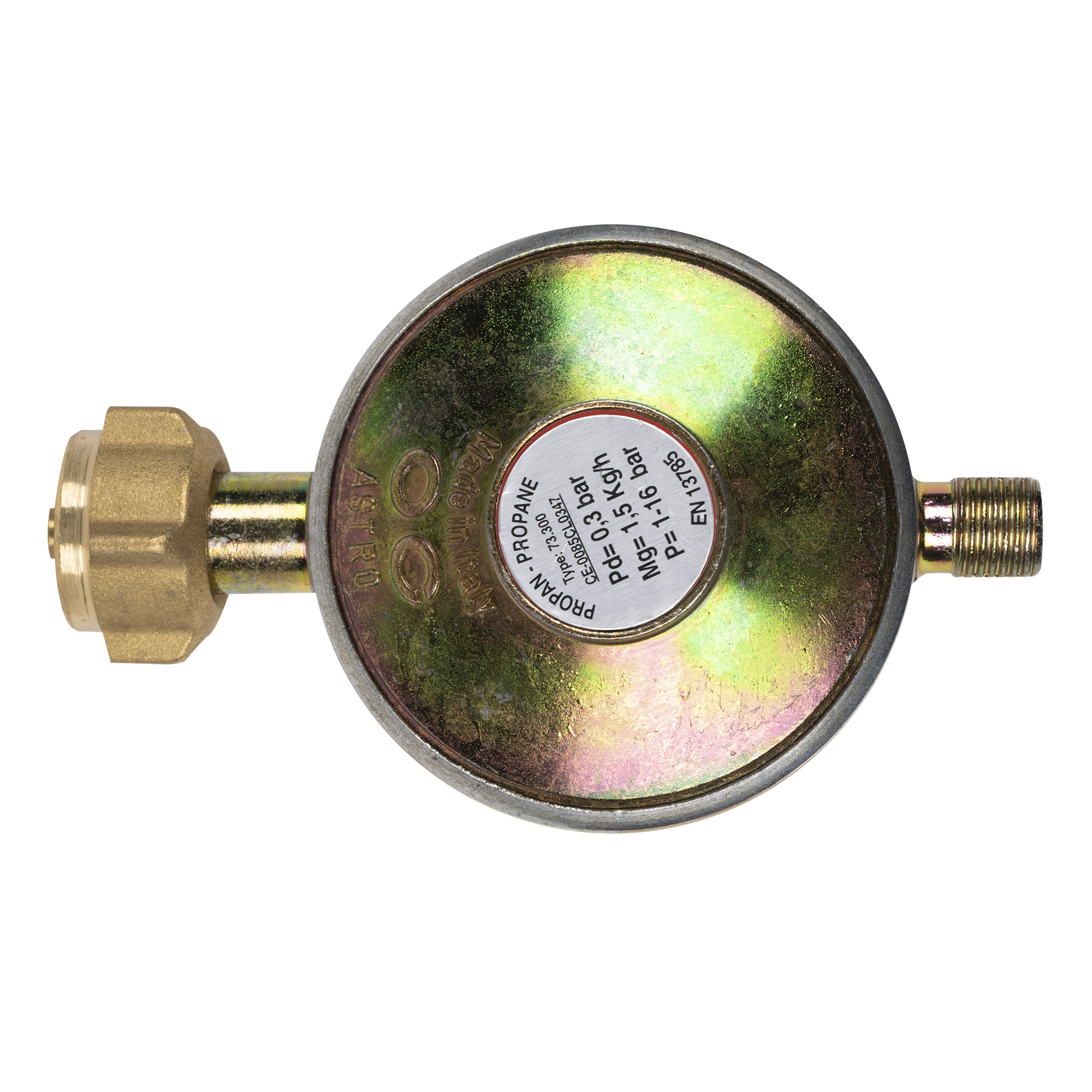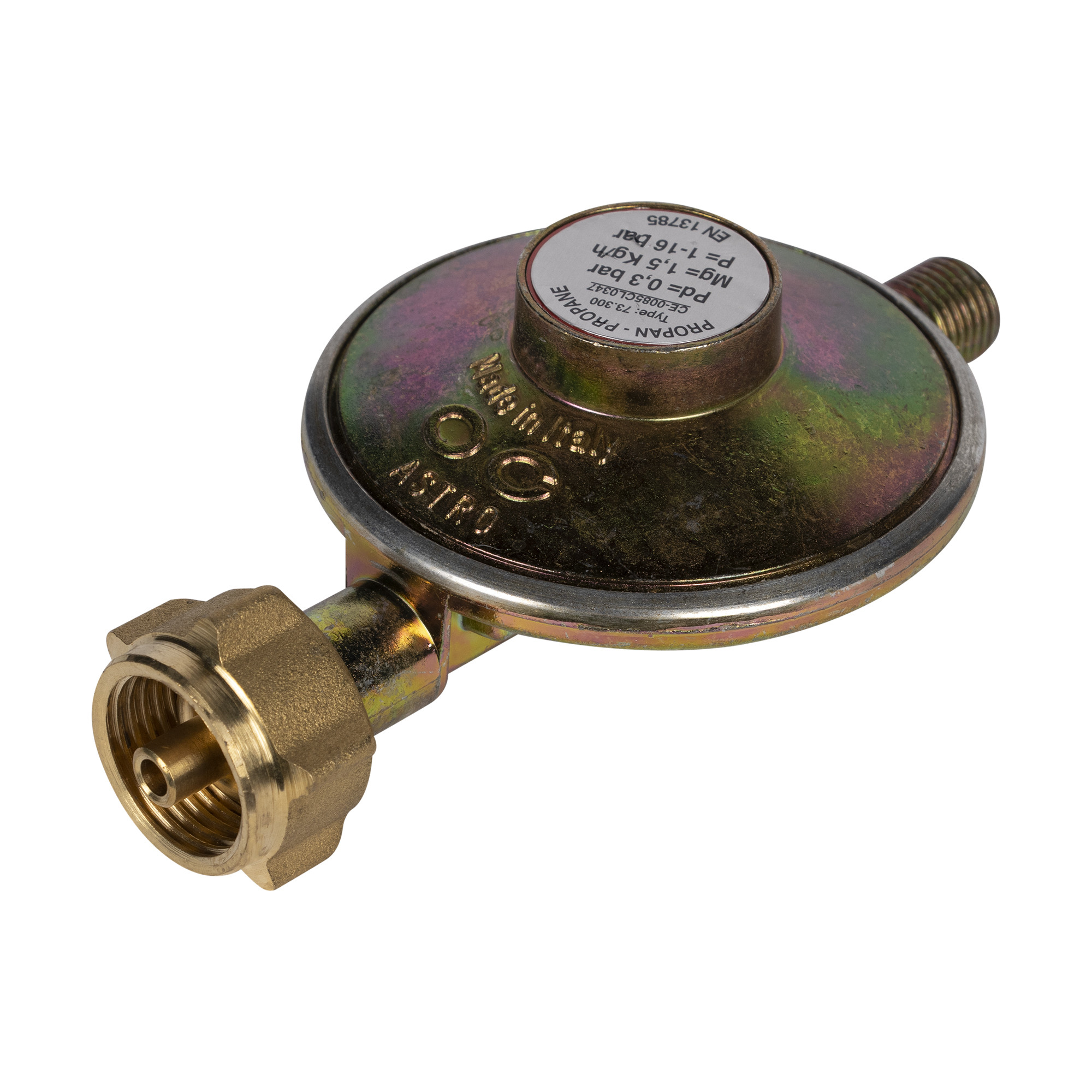 Редуктор газовый тип А для GP 10M (T30338-D), рассчитанный на входное давление 1–16 бар, с выходным давлением 0,3 бара и пропускной способностью 1,5 кг/ч. Используется для снижения давления пропана до безопасного уровня для подачи на бытовые или промышленные газовые приборы.
