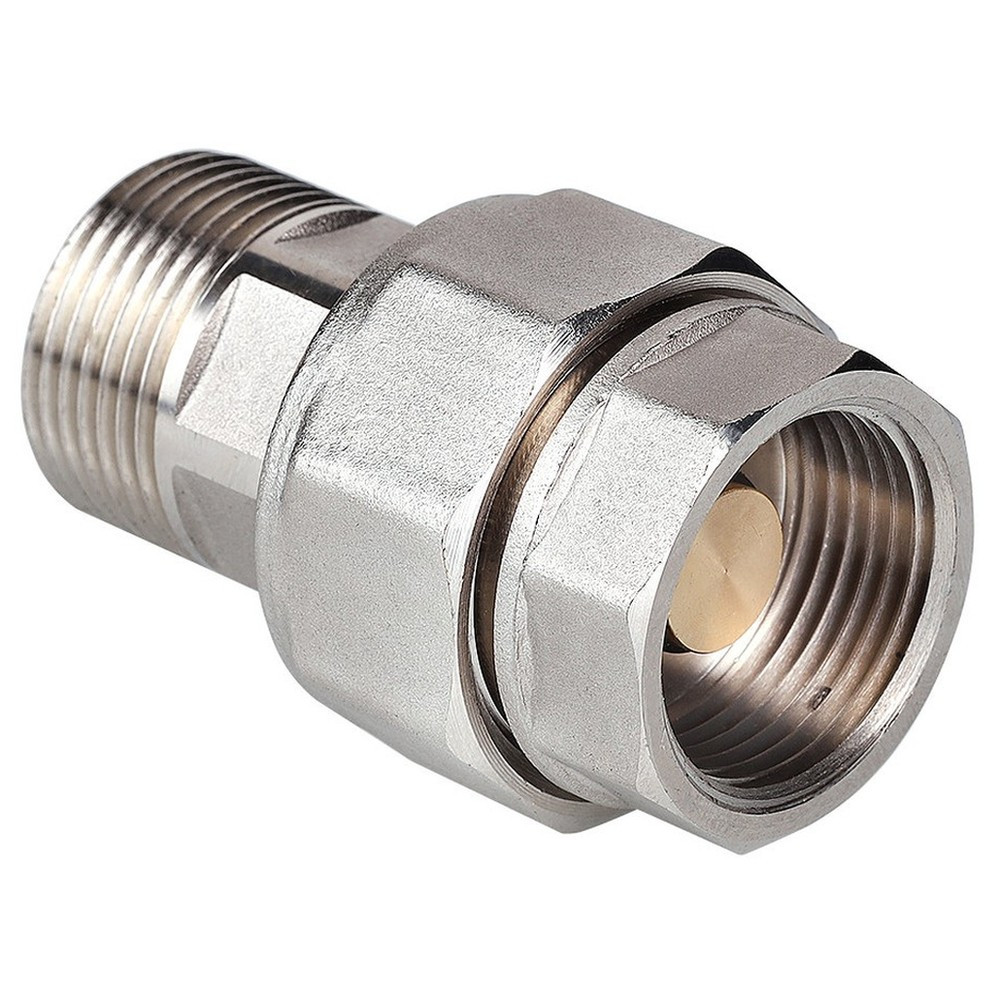 (VT.538.N) Разъемный сгон-отсекатель VT.538 позволяет разделять внутренние трубопроводы зданий и сооружений на участки, чтобы ремонтировать их без опорожнения всей системы. Основное применение фитинга – присоединение расширительного бака к трубопроводу системы отопления или ГВС. Фитинг состоит из двух полукорпусов, стянутых между собой накидной гайкой. Все три детали изготовлены из сантехнической латуни марки CW617N, никелированы. Между полукорпусами имеется уплотнительное кольцо из EPDM. В состав изделия входят два направленных в противоположные стороны пружинных обратных клапана с латунными (CW614N) золотниками. Когда накидная гайка завинчена до упора, клапаны находятся в открытом положении, не препятствуя протеканию рабочей среды. При раскручивании накидной гайки, подпружиненные золотники перекрывают проходные отверстия полукорпусов. Разъемный сгон-отсекатель VT.538 рассчитан на номинальное давление 16, испытательное – 24 бара. Максимальная температура рабочей среды – 110 °С.