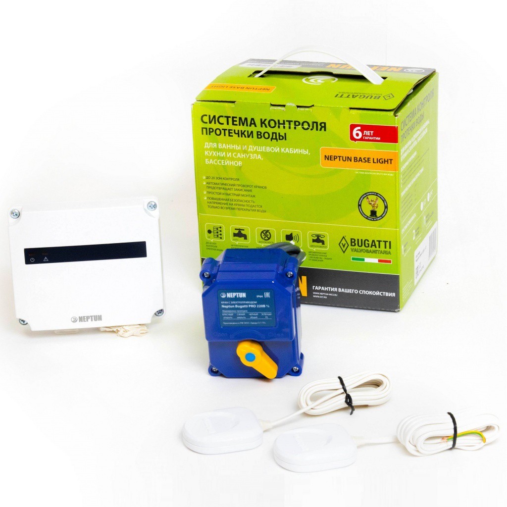 Модуль управления Neptun Base - 1 шт; Кран шаровый с электроприводом Bugatti Pro 220В - 1 шт; Датчик проводной - 2 шт