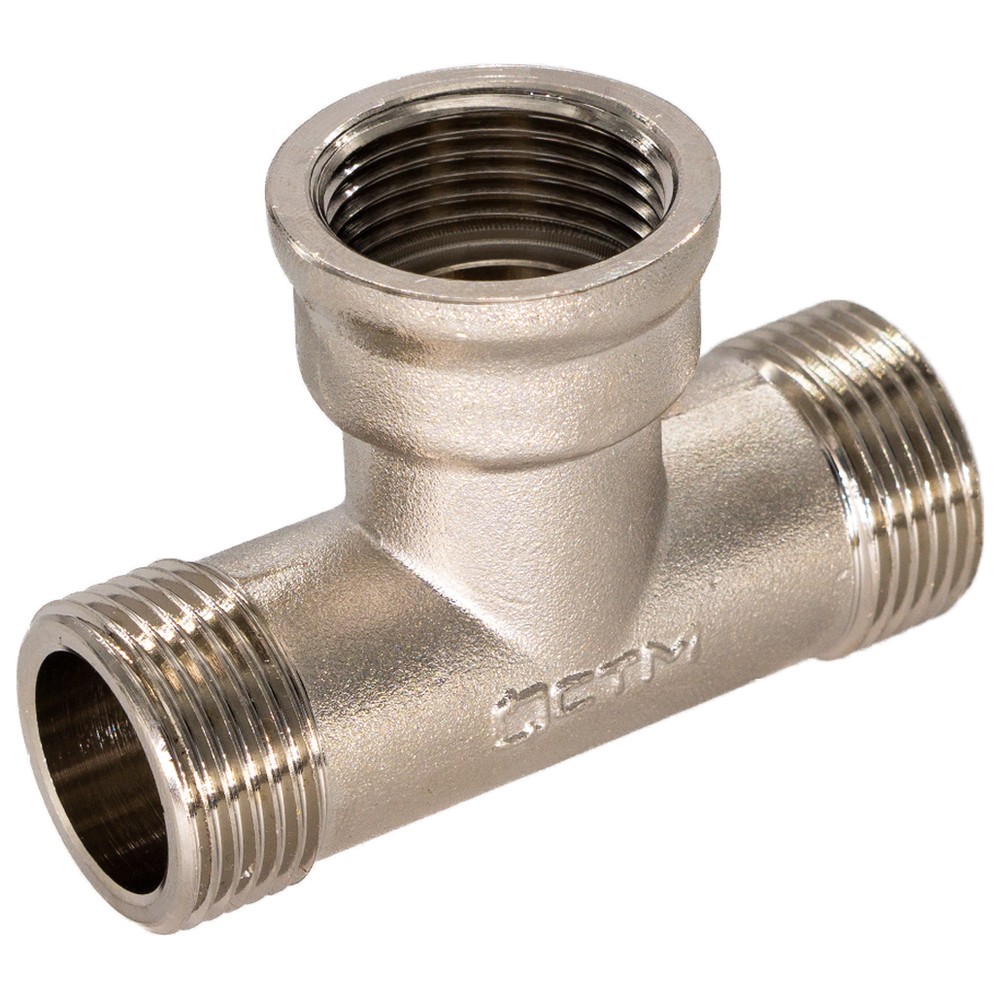 Тройник CTM с наружной/внутренней/наружной резьбой - трёхсторонний резьбовой фитинг. Предназначается для соединения частей трубопровода. Тройник изготавливается из высококачественной горячепрессованной латуни. Никелированное покрытие тройника даёт дополнительный запас прочности. Никелирование предотвращает появление коррозии, а также защищает от механического износа и вредного воздействия агрессивных жидкостей и воздушно-газовых сред. Резьба тройника нарезается на станке с ЧПУ. Наружная резьба тройника оснащена насечками, обеспечивающими лучшее сцепление с уплотнительным материалом при монтаже.