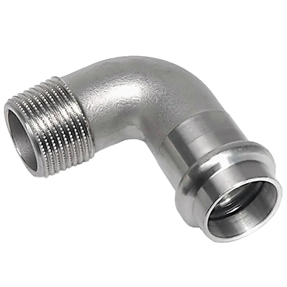 Пресс-фитинг из нержавеющей стали, угол 90° ВПр-НР предназначен для создания надежного и герметичного соединения двух труб под углом 90 градусов, где одна труба соединяется с помощью пресс-инструмента (внутренняя пресс-резьба ВПр), а другая — с помощью наружного резьбового соединения (наружная резьба НР). Это обеспечивает гибкость при монтаже и позволяет комбинировать пресс- и резьбовые соединения в одной системе, например, для подключения к элементам с внутренней резьбой. Изготовлен из нержавеющей стали, что гарантирует высокую коррозионную стойкость, гигиеничность и долгий срок службы. Угольники 90° ВПр-НР часто используются для перехода с пресс-системы на резьбовое соединение при подключении к запорной арматуре, приборам учета, смесителям или другому оборудованию.